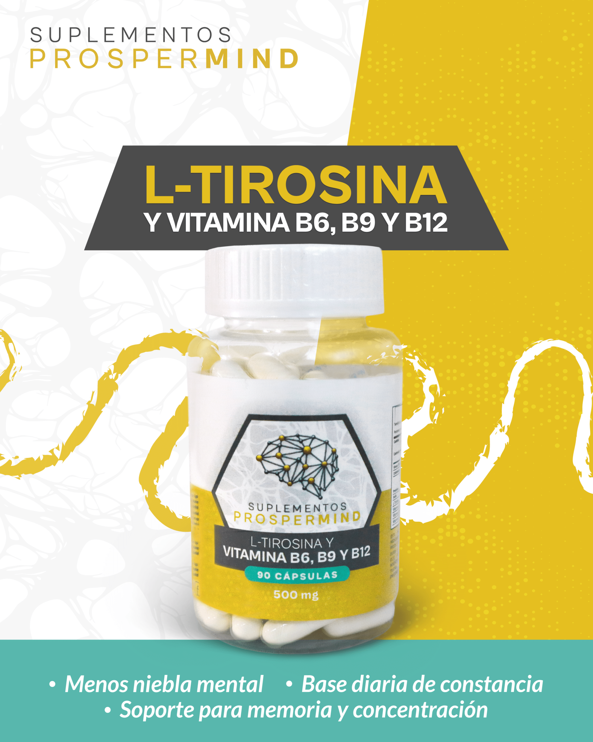 ProsperMind Day combina L-Tirosina (400 mg) con Complejo B (B6, B9, B12) para apoyar enfoque, arranque y constancia en días de alta demanda mental, sin recurrir a cafeína.