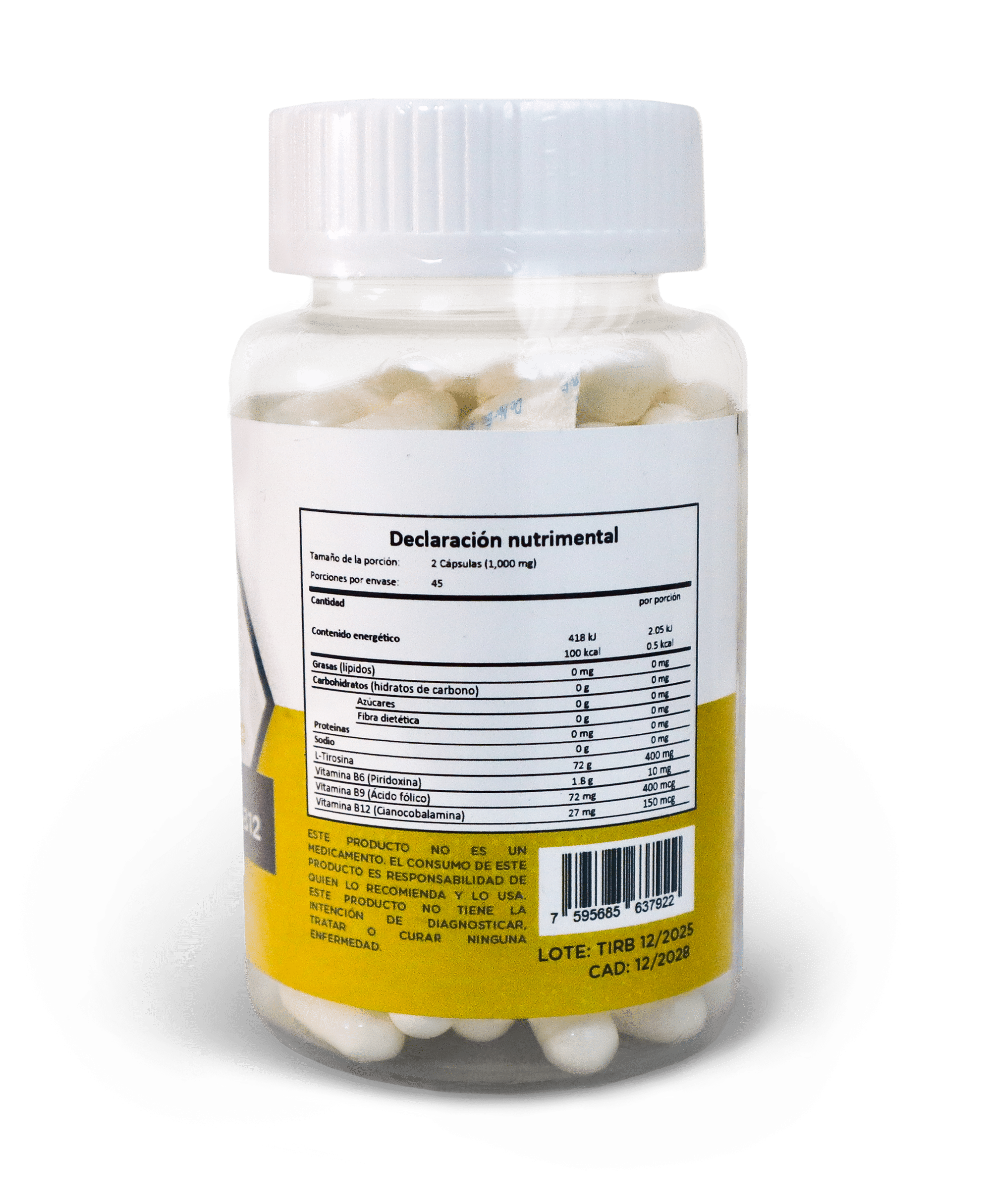 - Por cápsula: L-Tirosina 400 mg + B6 (P-5-P) 10 mg + B9 400 µg + B12 150–250 µg.